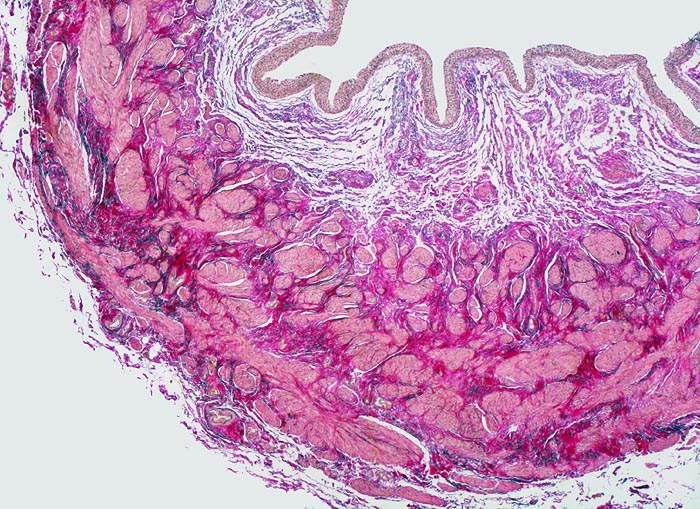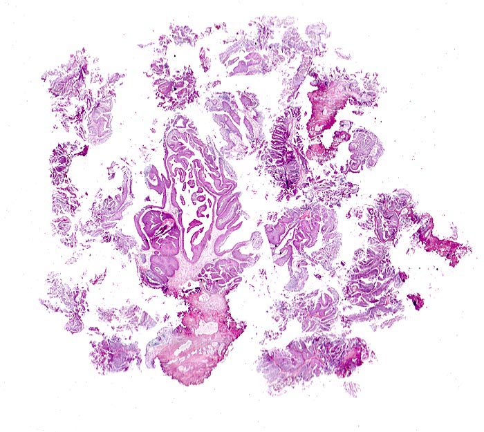 Histologisch sind die papillären Urothelkarzinome aufgebaut aus fingerförmigen, schlanken Papillen bedeckt von einem verbreiterten Urothel (mehr als 7 Zellagen breit) mit meist nur geringen zytologischen Atypien. Das subepitheliale Stroma ist per Definition nicht tumorinfiltriert.