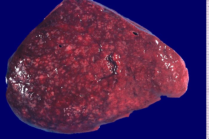 • Vergrösserter Lymphknoten mit zerstörter Lymphknotenarchitektur.