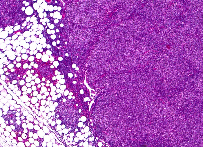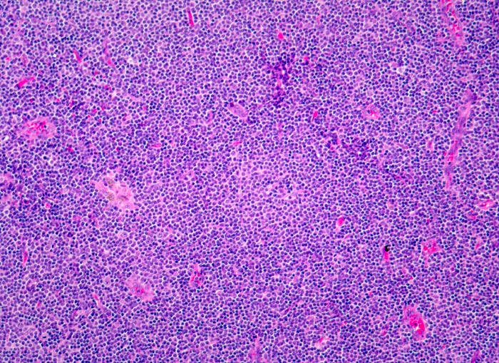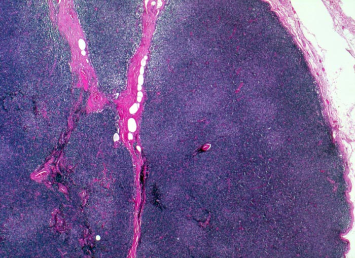 Befallene Lymphknoten weisen eine Zerstörung der normalen Architektur auf. Die neoplastischen Zellen bilden auf einem dunklen Hintergrund kleiner Zellen heller erscheinende Pseudofollikel bestehend aus vermehrt Paraimmunoblasten. Der dominierende Zelltyp ist etwas grösser als ein normaler Lymphozyt, der Kern ist rund und das Chromatin verklumpt. Der Zytoplasmasaum ist sehr schmal.