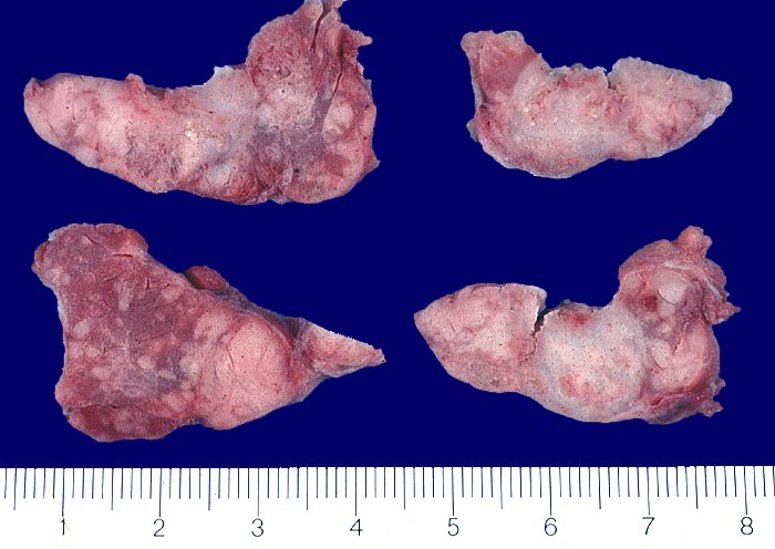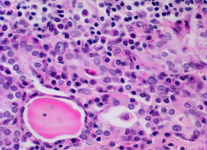Morphologie: Die Schilddrüse ist bei der Hashimoto-Thyreoiditis meist symmetrisch vergrößert und zeigt eine grau-gelblich und leicht knotige Schnittfläche. Mikroskopisch zeigt das Parenchym eine diffuse Infiltration durch Lymphozyten und Plasmazellen, mit oder ohne Keimzentren. Die Schilddrüsenfollikel sind klein, das Kolloid ist reduziert und das Follikelepithel atrophiert. Charakteristisch ist eine fokal ausgebildete oxyphile (syn. onkozytäre) Epithelmetaplasie Gelegentlich sind intrafollikuläre Makrophagen mit Riesenzellbildung und eine geringe Fibrosierung sichtbar. Bei einer ausgedehnten keloidähnlichen Fibrosierung handelt es sich um die fibröse Variante einer Hashimoto-Thyreoiditis, die in etwa 10% aller chronischen lymphozytären Thyreoiditiden vorkommt. Ein dominanter oder rasch wachsender Knoten und/oder eine rasche Grössenzunahme der Schilddrüse sollten zum Ausschluss eines Schilddrüsenkarzinoms bzw. malignen Lymphoms mittels Feinnadelaspirationszytologie abgeklärt werden.
