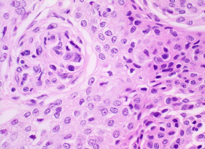 Kugelige Tumorzellverbände mit Ausbildung von typischen konzentrischen zwiebelschalenartigen Formationen und parallele Bündel spindeliger Zellen.