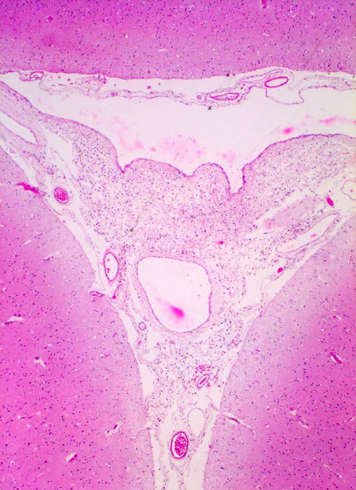 Das Meningeom zeigt ein grosses Spektrum histologischer Varianten mit sehr unterschiedlicher Morphologie. Am häufigsten sind meningotheliale (ihr Präparat), transitionale und fibroblastische Meningeome. Typisch für das meningotheliale Meningeom sind dicht gepackte Zellen mit unscharfen Zytoplasmagrenzen, Wirbelbildungen und Kerne mit intranukleären Vakuolen. Ferner finden sich konzentrische Verkalkungen in Form von Psammomkörperchen ( 255).