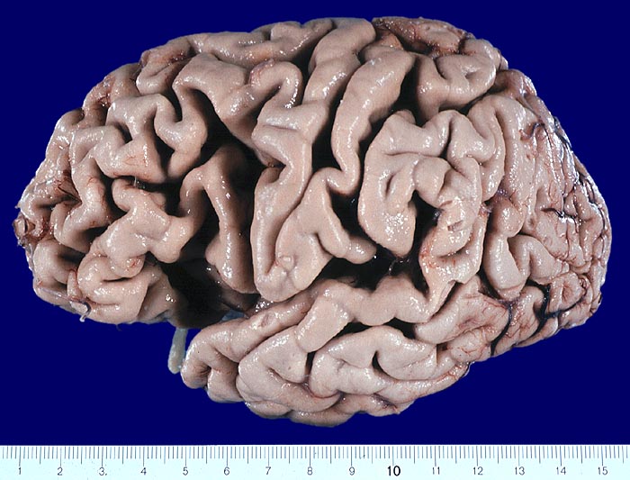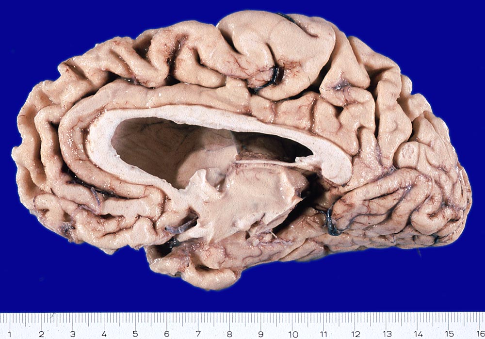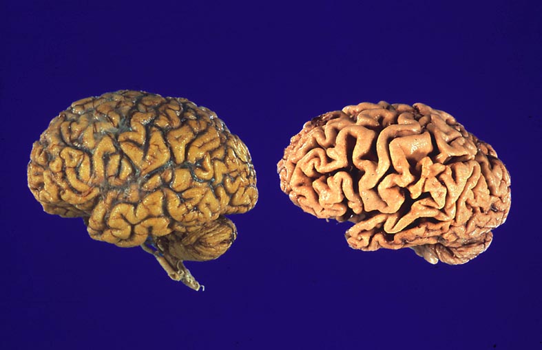 Gehirne von Alzheimer Patienten sind makroskopisch durch eine kortikale Atrophie (vor allem temporo-parietal) charakterisiert. Weiter findet sich meist eine deutliche Atrophie von Hippocampi und Mandelkernen. Diese geht einher mit einem Hydrocephalus internus (e vacuo), wobei vor allem die Temporalhörner der Seitenventrikel betroffen sind.