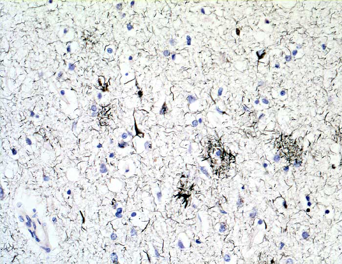 Die Alzheimerfibrillen (=Tangles) sind intraneuronale Einschlüsse, die aus Aggregaten des Mikrotubulus-assoziierten Proteins Tau in hyperphosphorylierter Form bestehen. Ausserdem finden sich Tau-Ablagerungen in Neuriten (=Neuropilfäden=neuropil threads). Im Gegensatz zu den Plaques korrelieren Dichte und Verteilungsmuster von Alzheimerfibrillen und Neuropilfäden wesentlich besser mit dem klinischen Schweregrad der neuropsychologischen Beeinträchtigung. Das Auftreten und das Verteilungsmuster von Alzheimerfibrillen und Neuropilfäden verläuft nach einem stereotypen Muster, das für die Stadieneinteilung I bis VI nach Braak benutzt wird. Braak unterscheidet ein entorhinales Stadium (I/II), ein limbisches Stadium (III/IV) und ein neokortikales Stadium (V/VI). Beim Nachweis von zahlreichen neuritischen Plaques und Neurofibrillenveränderungen entsprechend einem Braak Stadium V oder VI besteht eine hohe Wahrscheinlichkeit, dass die Demenz durch Morbus Alzheimer verursacht wurde. Die Fibrillenveränderungen lassen sich in der Gallyas-Färbung besonders gut darstellen (Versilberung).
