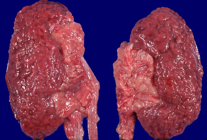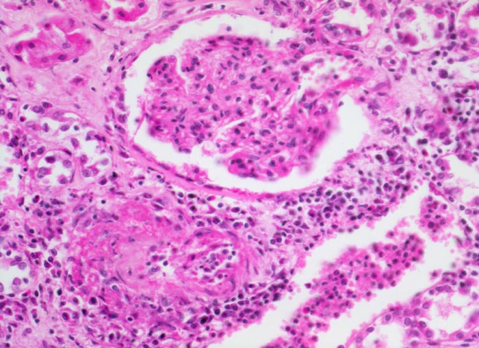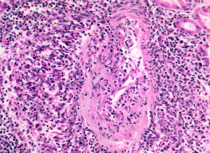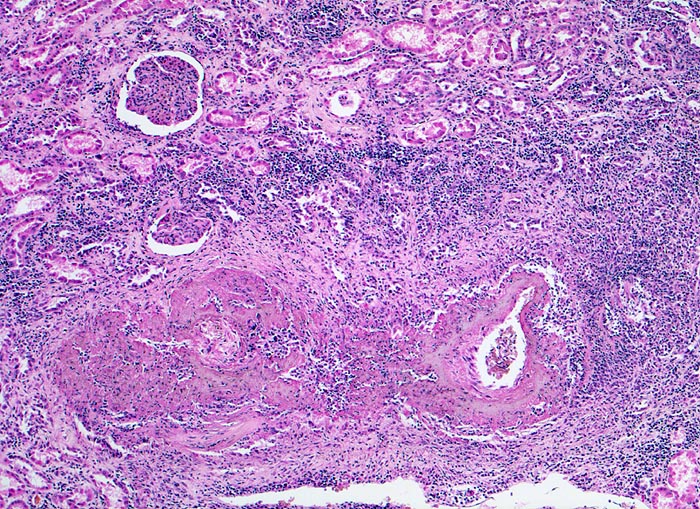Es handelt sich um eine systemische nekrotisierende Vaskulitis mit Befall mittelgrosser und kleiner Arterien meist ohne Befall von Arteriolen, Kapillaren (Glomerula!) und Venolen. Der Nierenbefall ist Teilaspekt einer Systemkrankheit mit bevorzugtem Befall von Niere, Herz, Leber, Magen-Darmtrakt und Muskulatur.