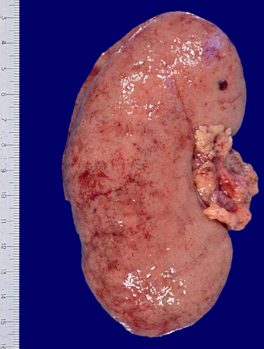In den beteiligten Organen sind nicht alle Arterien pathologisch verändert und oft ist die Gefässwand nicht zirkulär sondern nur segmental betroffen und die Gefässveränderungen befinden sich in unterschiedlichen Stadien. Folgen der Gefässveränderungen sind Infarkte und Mikroaneurysmata. Die Nieren sind im akuten Stadium oft vergrössert. An der Oberfläche sind Petechien neben unterschiedlich grossen Infarkten erkennbar. Gelegentlich erkennt man auf der Schnittfläche Gefässaneurysmata, thrombosierte Arterien und Papillennekrosen. Im häufigeren chronischen Stadium sind die Nieren verkleinert und aufgrund von Infarktnarben grob gebuckelt. Befallen sind prärenale und grössere intrarenale Nierenarterienäste bei meist fehlender Beteiligung der Arteriolen und definitionsgemäss fehlendem Befall der glomerulären Kapillaren. Die betroffenen Gefässe zeigen segmentale transmurale oft durch Thrombosierung komplizierte Wandnekrosen mit initial granulozytenreichem Infiltrat. Im Verlauf werden die Nekrosen durch Granulations- und Narbengewebe organisiert. An grossen Arterien kann dies zu Knotenbildungen und Aneurysmata führen. Oft findet man in ein und demselben Gefäss frische Nekrosen neben reparativen Veränderungen und Narben. Das übrige Nierengewebe zeigt als Folge der Vaskulitis Kollapsglomerula, Infarkte und ischämische Tubulusatrophie mit begleitender interstitieller Fibrose und Entzündung.