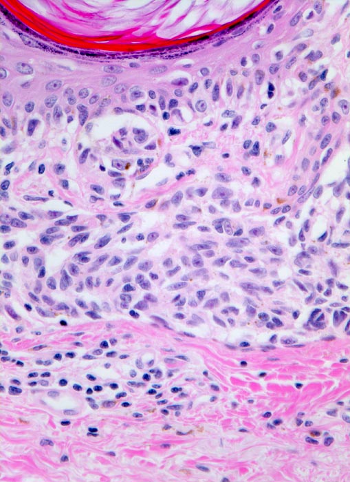 • Die epidermale Melanomkomponente besteht aus in der Epidermis aufsteigenden atypischen Melanozyten (=pagetoide Ausbreitung) und unterschiedlich grossen Zellnestern durchmischt mit Melanophagen.
