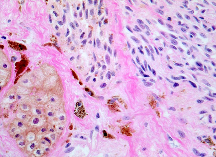 • Links auf dem Präparat sind unterhalb des Melanoms dermale Reste eines vorbestehenden gewöhnlichen Naevuszellnaevus erkennbar. Naevuszellen deutlich kleiner und zytoplasmaärmer mit kaum erkennbaren Nukleolen.