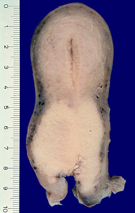 Morphologie: Die HPV Infektion kann gelegentlich aufgrund zytopathischer Effekte in den infizierten oberflächlichen Plattenepithelzellen erkannt werden. Die zytopathisch veränderten Zellen nennt man Koilozyten. Koilozyten weisen einen hellen perinukleären Hof und einen verdickten peripheren Zytoplasmasaum auf ( 5546)( 5547). Sie enthalten einen oder mehrere hyperchromatische dunkle Zellkerne. Ein flaches Areal mit zytopathisch veränderten Plattenepithelzellen wird als flache kondylomatöse Läsion bezeichnet ( 1093). Die LSIL ist gekennzeichnet durch Zellatypien und Mitosefiguren im unteren Epitheldrittel, während die oberen Zweidrittel des Epithels ausreifen (Verkleinerung der Zellkerne und vermehrtes Zytoplasma in den oberflächlichen Zellen). Bei der HSIL breiten sich die Zellatypien und Mitosefiguren auf das mittlere (CIN II) und obere Drittel (CIN III, Cis) des Epithels aus. Die oberflächlichen Zellen des Carcinoma in situ reifen nicht mehr aus und zeigen entsprechend eine hohe Kern-Plasmarelation. Karzinome unterscheiden sich von einem Carcinoma in situ durch zungenförmige Tumorausläufer, welche die Basalmembran durchbrochen haben oder die Anwesenheit von kleinen Zellnestern ohne Basalmembran in desmoplastischem Stroma. Das invasive Karzinom verursacht meist eine Stromareaktion in Form eines Ödems, einer desmoplastischen Fibrose, chronischer Entzündung oder einer granulomatösen Entzündung. Makroskopisch können die invasiven Tumoren exophytisch polypoid, papillär, oder endophytisch wachsen. Bei den invasiven Karzinomen unterscheidet man verhornende und nicht verhornende Karzinome, wobei der Verhornungsgrad keine prognostische Relevanz besitzt.