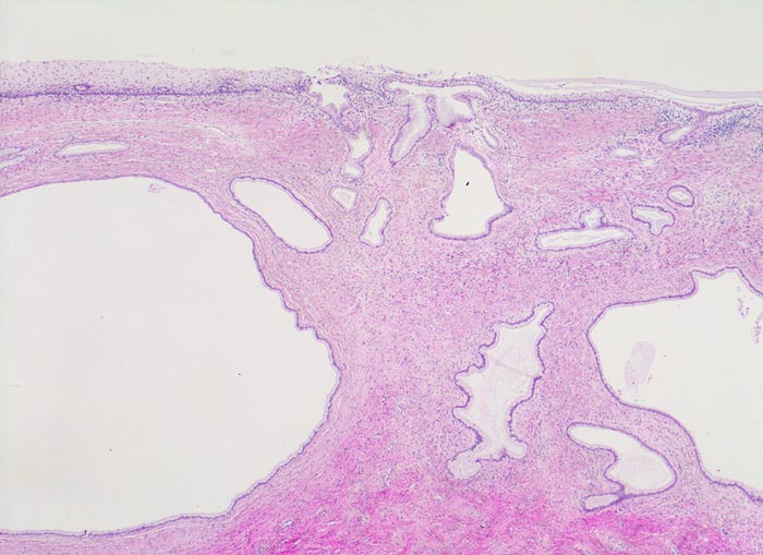 Einwachsen des Carcinoma in situ in vorbestehende endozervikale Drüsenschläuche.