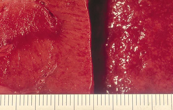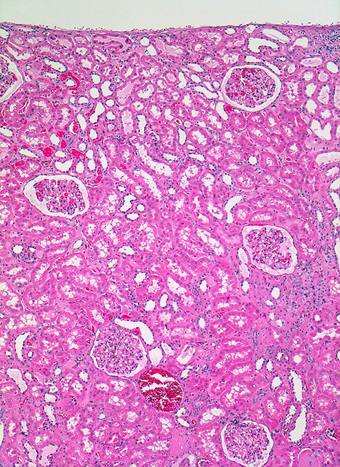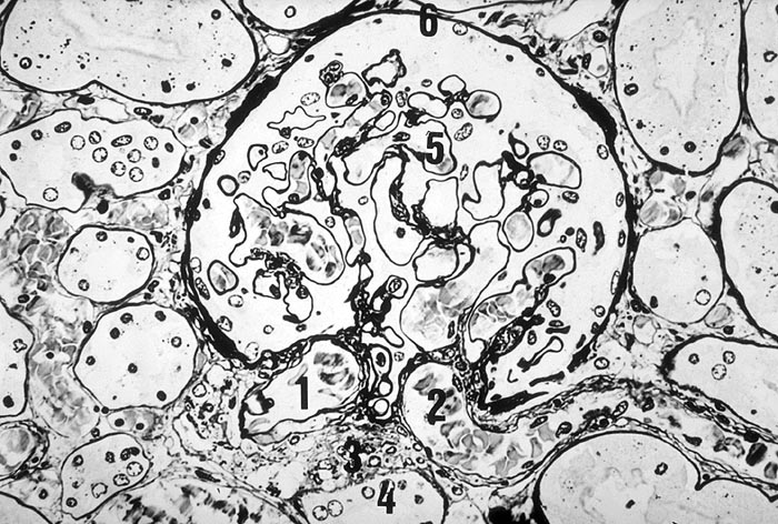Morphologie: Im allgemeinen ist die Niere infolge von Glomerulumhypertrophie und Tubulushyperplasie vergrössert und derb, die Oberfläche ist granuliert. Bei schwerer Atherosklerose und fortgeschrittener Niereninsuffizienz kann die Niere auch normal gross oder verkleinert sein. Die Kombination von nodulärer Glomerulosklerose, hyalinen Schlingenkappen (=Proteinthromben in den Glomerulumschlingen ( 1916)) oder Kapseltropfen ( 1907) und Arteriolosklerose in Vas afferens und efferens ist beweisend für eine diabetische Nephropathie. Jede einzelne Läsion für sich genommen ist aber unspezifisch. Eine noduläre Glomerulosklerose kann auch vorkommen bei membranoproliferativer Glomerulonephritis ( 2652), Leichtkettenglomerulopathie oder Amyloidose ( 2019). Der nodulären Glomerulosklerose geht bei Diabetikern eine diffuse Glomerulosklerose ( 1906) voraus. Dabei zeigen die glomerulären Basalmembranen und das Mesangium eine progrediente gleichförmige Verbreiterung. Bei der nodulären und diffusen Glomerulosklerose handelt es sich aber wahrscheinlich um zwei pathogenetisch unterschiedliche, sich überlagernde Krankheitsbilder. Typisch bei Diabetikern ist im Unterschied zur arteriellen Hypertonie die Arteriolosklerose von Vas afferens und efferens ( 1911) und oft auch der Vasa recta. Intrarenale Arterien können eine Atherosklerose mit Atheromen zeigen. Subendotheliale Proteinablagerungen teilweise mit Verschluss der Glomerulumschlingen (Schlingenkappen) und knotige Proteinablagerungen in der Bowman'schen Kapselbasalmebran (Kapseltropfen) gehören zu den sogenannten exsudativen Läsionen ( 1919)( 1920) der diabetischen Nephropathie und führen zu Synechien sowie zur globalen Glomerulosklerose. Gleichzeitig mit den Glomerulumveränderungen treten tubuläre Basalmembranverbreiterungen auf, später eine Tubulusatrophie und interstitielle Fibrose mit Begleitentzündung. Auch die Basalmembranen der peritubulären Kapillaren sind verdickt.