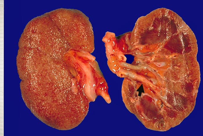 Arteriolosklerose von Vas afferens und efferens (Gefässwandhyalinose durch Ablagerung von Plasmaproteinen und Lipiden in der Gefässwand).