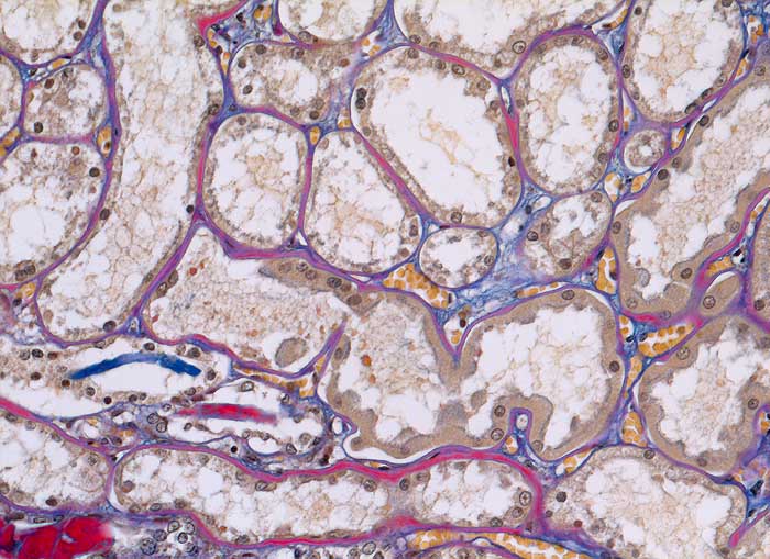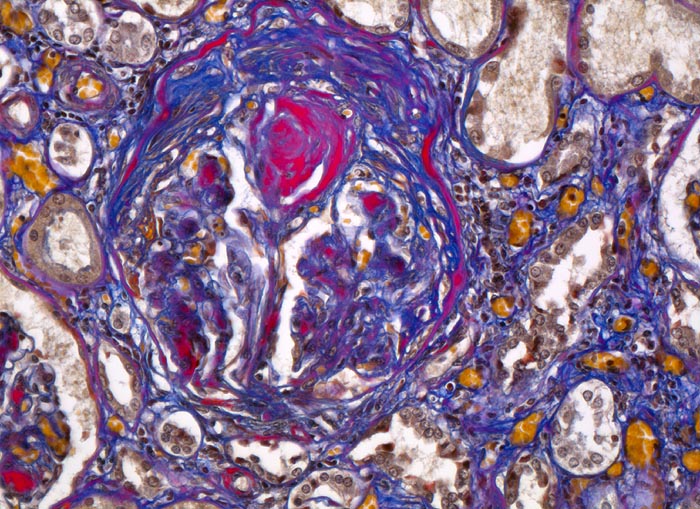 Aetiologie: Die renale Mikroangiopathie bei Diabetes mellitus ist Folge einer Matrixstörung besonders charakterisiert durch eine Zunahme von Kollagen Typ IV in der mesangialen Matrix und in den Basalmembranen von Glomerula, Gefässen und Tubuli.