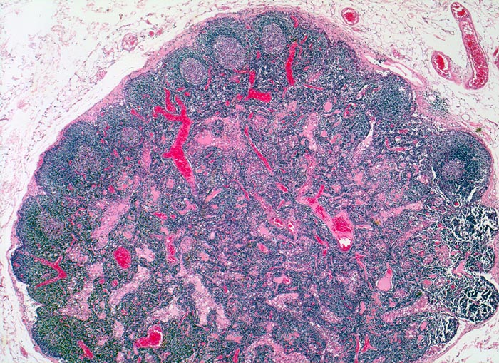 • Zerstörung der Lymphknotenarchitektur durch diffuses Lymphominfiltrat.