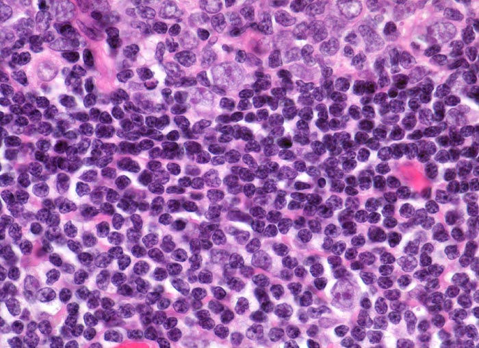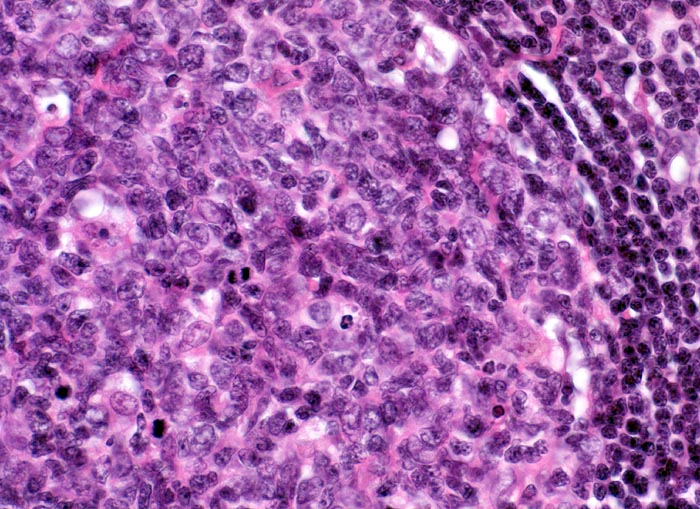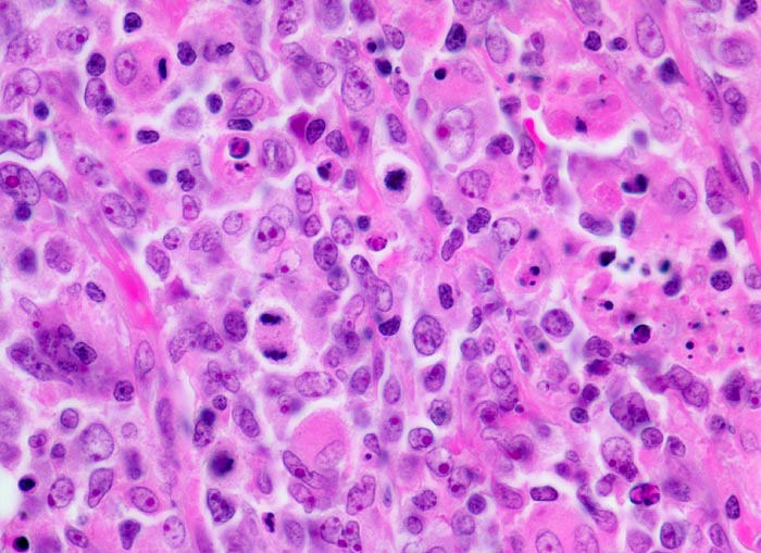 • Grosse polymorphe Tumorzellen mit unregelmässig geformten vesikulären Kernen und einem zentralständigen Nukleolus (Immunoblasten) oder multiplen randständigen Nukleolen (Zentroblasten).
