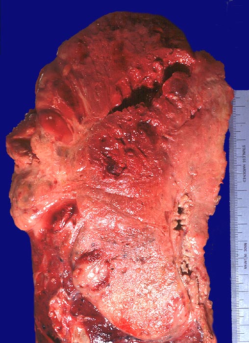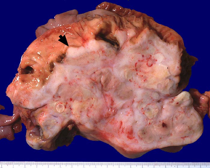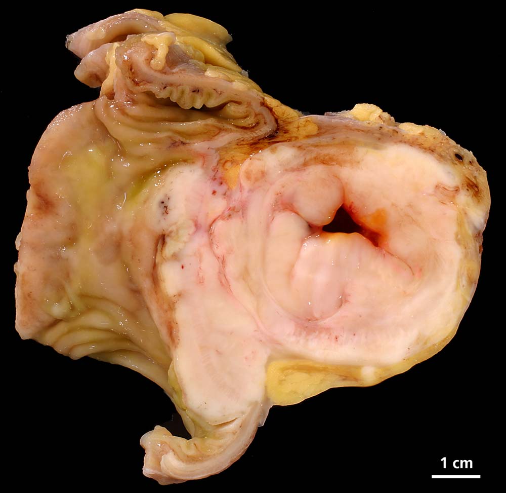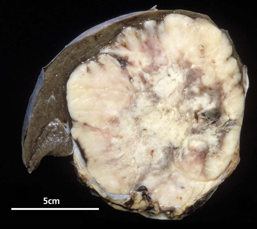 Befallene Lymphknoten zeigen einen Ersatz der normalen Strukturen durch homogenes fischfleischartiges, grauweisses Tumorgewebe. Einblutungen, Nekrosen oder Fibrose sind möglich. Histologisch destruieren die neoplastischen Infiltrate die normalen Strukturen des Lymphknotens bzw. des extranodalen Gewebes diffus (> 3464) (> 3094). Der Lymphknotenbefall kann komplett, partiell, interfollikulär oder seltener sinusoidal sein. Oft wird das perinodale Gewebe infiltriert. Morphologisch lassen sich mehrere Varianten unterscheiden (immunoblastisch, zentroblastisch u.a.), welche keine gesicherte prognostische Bedeutung haben. Standardmässig werden heute der sogenannte „cell-of-origin“ (COO) sowie der „double-expressor status“ (MYC/BCL2) als prognostisch/prädiktive Biomarker beim DLBCL bestimmt.