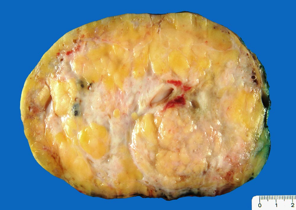 Ausgeprägte Fibrose und zystisch erweiterte Gangstrukturen in organoider Anordnung.