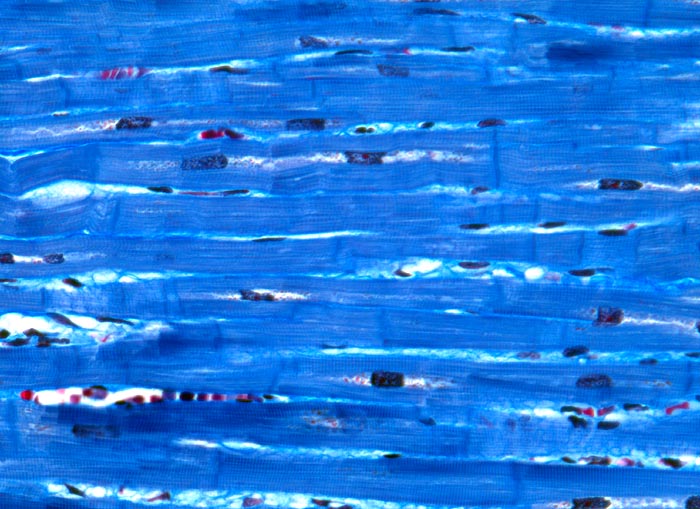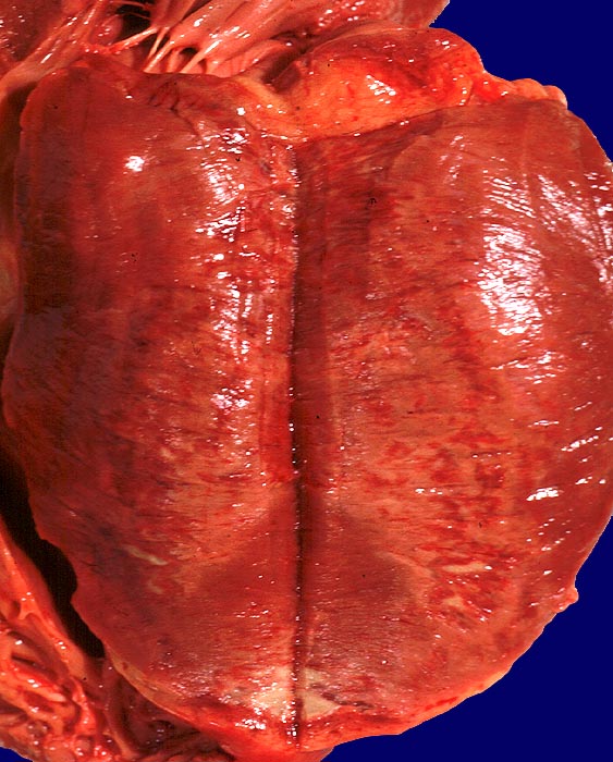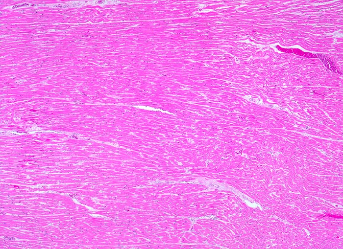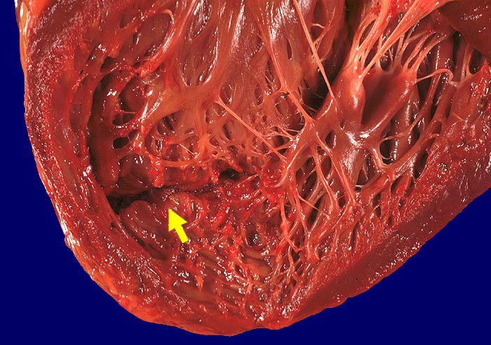 • Transmuraler Schnitt der linken Herzkammer. Oben: epikardiales Fettgewebe. Unten: Trabekel ausgekleidet von Endokard.