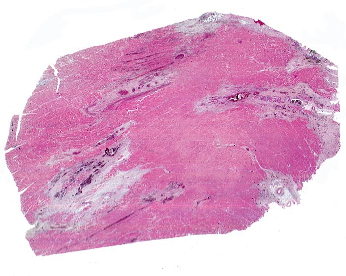 • Koagulationsnekrose und Granulationsgewebssaum machen mehr als 50% der Herzwanddicke aus (=transmuraler Infarkt).