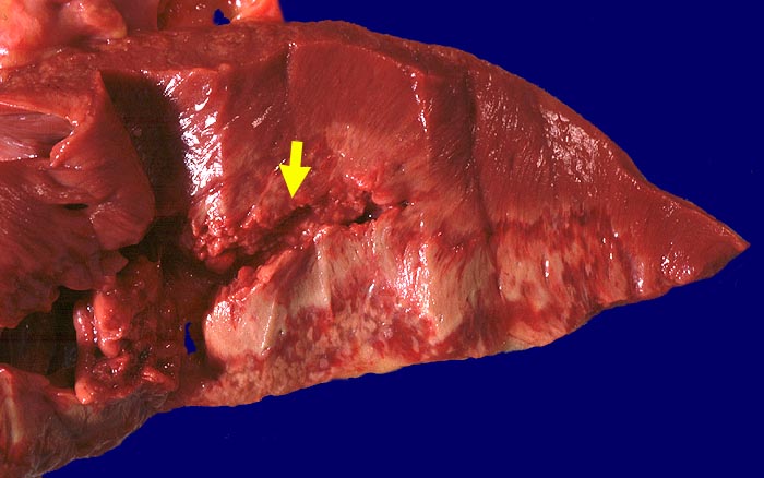 • Die Koagulationsnekrose wird auf allen Seiten gesäumt von einem breiten Granulationsgewebssaum mit Gefässen, Entzündungszellen (v.a. Makrophagen mit gelbbraunem Siderinpigment und Lipofuszinpigment, wenig Lymphozyten und Plasmazellen) und Fibroblasten.