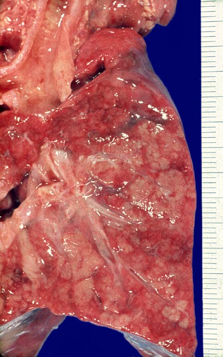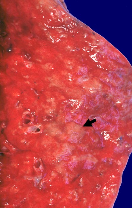 Eine Pneumonie kann einen ganzen Lappen befallen (Lobärpneumonie), Alveolen in der Umgebung eines Bronchus (Bronchopneumonie) oder das Interstitium (interstitielle Pneumonie) mit entsprechend unterschiedlichen makroskopischen Befunden. Bei einer schweren Bronchopneumonie sind meist mehrere Lappen befallen und es lassen sich bereits makroskopisch gelbliche, leicht erhabene, brüchige, unscharf begrenzte, gelegentlich zentral abszedierte Herde von einigen Millimetern bis wenigen Zentimetern Durchmesser nachweisen. Der Abstrichsaft ist trübe. Die befallenen Lappen sind vergrössert und aufgrund des entzündlichen Ödems schwerer. In einigen Fällen lässt sich eine fibrinöse Pleuritis (> 316) oder selten ein Pleuraempyem (> 775) nachweisen. Bei einer eitrigen Herdpneumonie ist die Mukosa der Bronchien und Bronchiolen ganz oder teilweise zerstört und mit einem fibrinös-eitrigen Exsudat belegt. Im Lungenparenchym selbst sind unterschiedlich grosse Infiltratherde bevorzugt um die Luftwege erkennbar. Benachbarte Alveolen sind gefüllt mit Granulozyten, Erythrozyten, Fibrin und eventuell Bakterien. Die Herde können konfluieren oder zentral einschmelzen (abszedierende Pneumonie) (> 195)