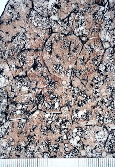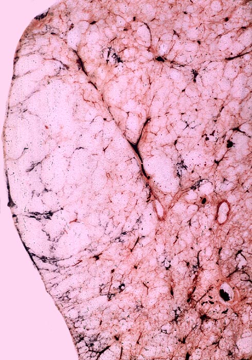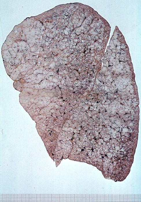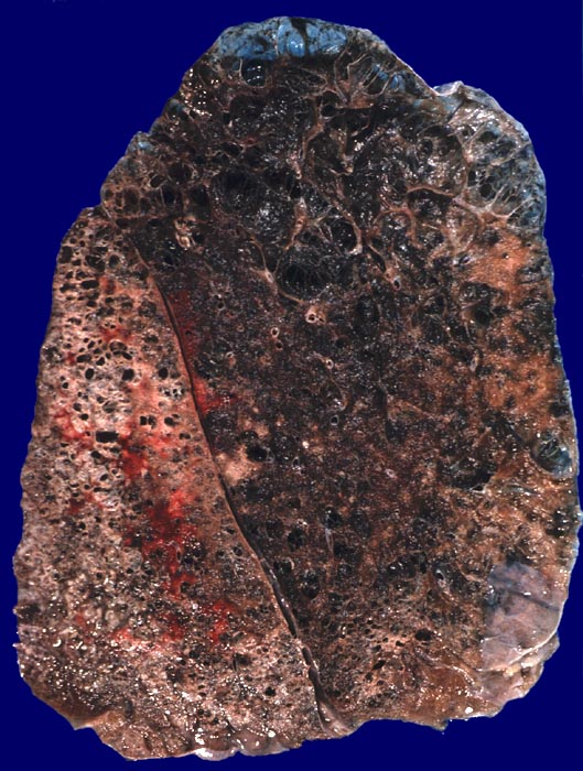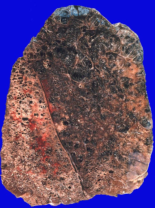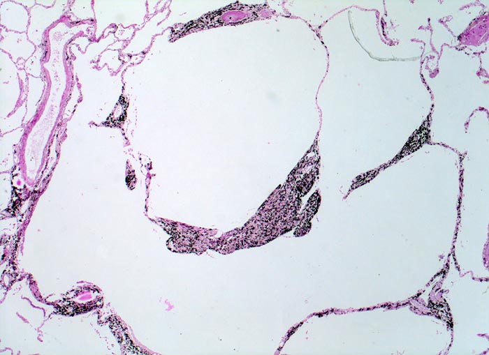 Morphologie: Morphologisch lassen sich zentroazinäre ( 3484), panazinäre ( 3599) und paraseptale Emphyseme ( 3487) unterscheiden sowie das Narbenemphysem in der Umgebung vernarbter Lungenareale. Das zentroazinäre (=zentrolobuläre) Emphysem (vorliegendes Präparat) beginnt primär in den respiratorischen Bronchiolen und breitet sich von dort nach peripher aus. Es spart die terminalen Bronchiolen aus. Diese Form des Emphysems ist assoziiert mit langdauerndem Zigarettenrauchen und befällt bevorzugt die Lungenoberlappen. Das panazinäre Emphysem zerstört den gesamten Alveolus (respiratorische und terminale Bronchiolen). Diese Form des Emphysems ist bevorzugt in der unteren Lungenhälfte lokalisiert und ist assoziiert mit einem homozygoten alpha 1- Antitrypsinmangel oder einem Marfansyndrom. Es befällt eher die Lungenbasen. Bei Rauchern kann ein zentroazinäres Emphysem kombiniert sein mit einem fokalen panazinären Emphysem der Lungenbasen. Das paraseptale oder periazinäre Emphysem zerstört distale Anteile des Azinus, welche an das Bindegewebe der Pleura oder der Interlobarsepten angrenzen. Die Belüftung der Lunge ist beim paraseptalen Emphysem meist nicht gestört, aber sehr grosse Bullae können das angrenzende Lungenparenchym komprimieren. Histologisch sind die Lufträume erweitert und enthalten frei flottierende Alveolarsepten mit knotenförmigen Spitzen. Peribronchiolär finden sich beim zentroazinären Emphysem reichlich Ablagerungen von schwarzem Anthrakosepigment.