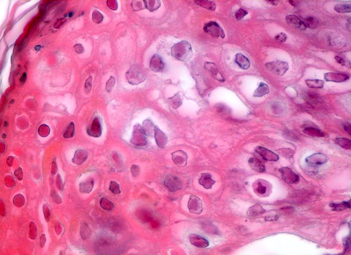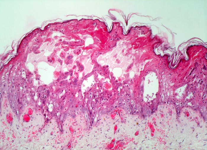 Histologisch zeigen sich am Rand der intra- und subepidermalen Blasen die zytopathisch veränderten Plattenepithelzellen mit homogenen intranukleären Einschlüssen umgeben von einem Halo (Cowdry A) oder milchglasartigem Kern (Cowdry B). Typisch sind multinukleäre Riesenzellen. Solche Zellen sind im zytologischen Abstrich nachweisbar (Tzanck-Test).