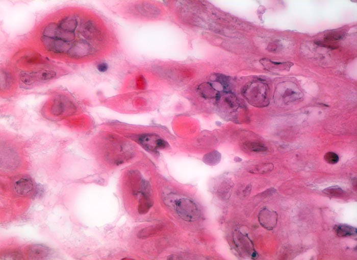Zytopathische Veränderungen der Keratinozyten im Randbereich des Bläschens bzw. des Hautulkus: Keratinozyten mit stahlgrauen milchglasartigen Kernen mit kondensiertem Chromatin in der Kernperipherie. Syncytiale mehrkernige Riesenzellen, deren Kerne sich gegenseitig eindellen (nuclear molding).