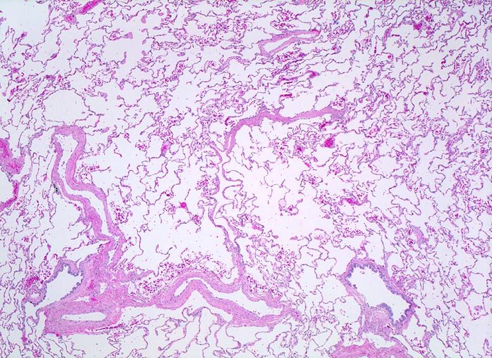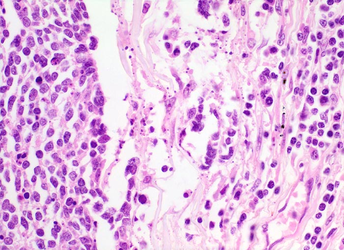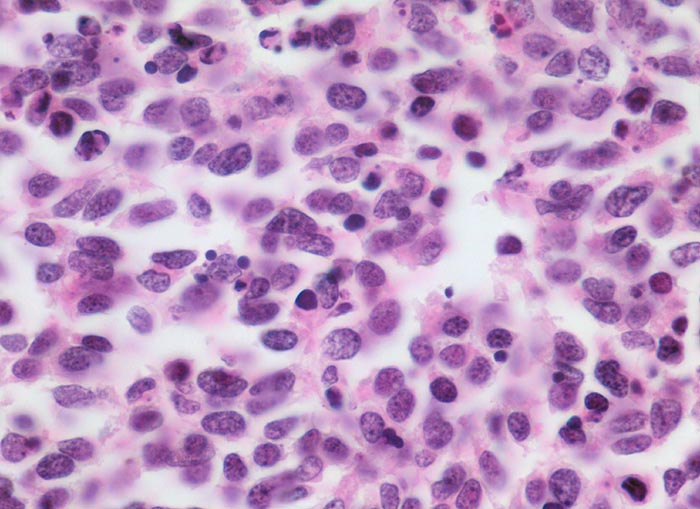 Die monomorphen rundlichen, fusiformen oder polygonalen Tumorzellen haben sehr wenig Zytoplasma, die Kerne sind hyperchromatisch und Nukleolen sind kaum zu erkennen. Die Tumorzellen bilden lockere Verbände, bandförmige Anordnungen oder Pseudorosetten um Gefässe. Oftmals zeigen die Tumoren in der Biopsie charakteristische Quetschartefakte. Ein histologisches Grading wird im Gegensatz zu den nicht kleinzelligen Karzinomen nicht vorgenommen. An kleinen Biopsien kann die morphologische Unterscheidung eines kleinzelligen Karzinoms von einem Lymphom bzw. von normalem lymphatischem Gewebe schwierig sein ( 1101). Diese Unterscheidung gelingt aber meist problemlos mit Hilfe einer immunhistochemischen Zusatzuntersuchung ( 1100).