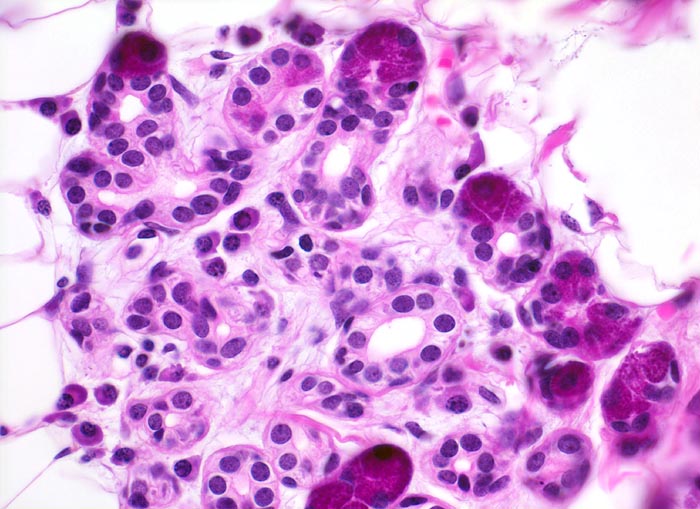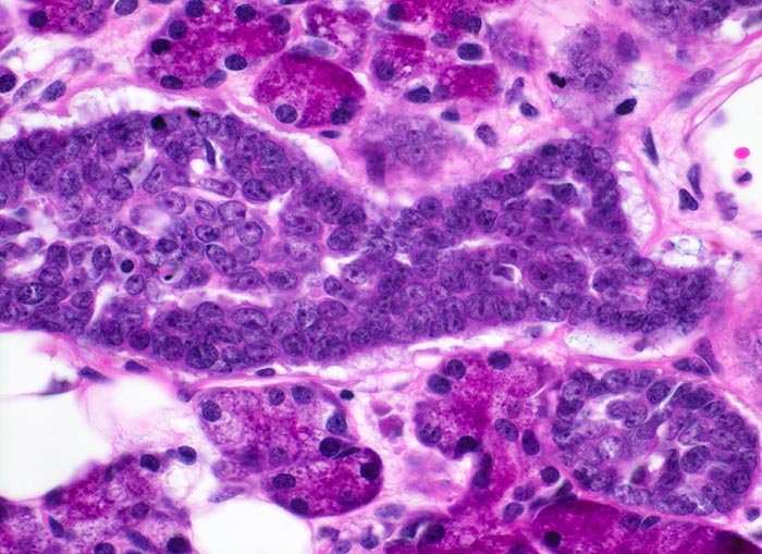 Adenoidzystische Karzinome zeigen drei Wachstumsmuster (in abnehmender Reihenfolge): kribriform, tubulär und solide. Die Hohlräume in den kribriformen Arealen entsprechen keinen echten Drüsenlumina, sondern sind Bestandteil des Tumorstromas. Sie enthalten PAS positives Sekret oder hyaline Substanzen. Die strangförmigen Tubuli begleitet von hyalinem Stroma. Typischerweise (allerdings nicht im vorliegenden Präparat) kann eine Perineuralscheideninvasion nachgewiesen werden. Kleine Tumoren können scharf begrenzt sein, grössere Tumoren wachsen infiltrativ.