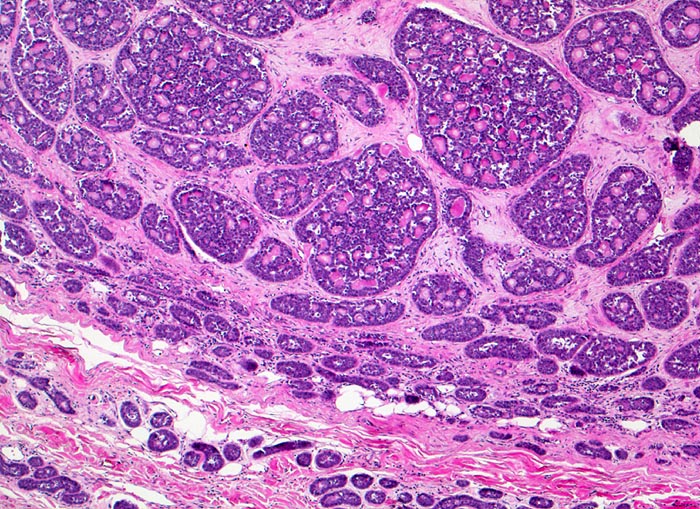Das adenoidzystische Karzinom ist eine seltene Form des Adenokarzinoms im Kopf-Hals Bereich. Seltener tritt es in der Mamma oder auch an anderen Lokalisationen auf. Am häufigsten wird dieses Karzinom in der Parotis, in der Glandula submandibularis und in den kleinen Speicheldrüsen des Gaumens (in abnehmender Reihenfolge) diagnostiziert.
