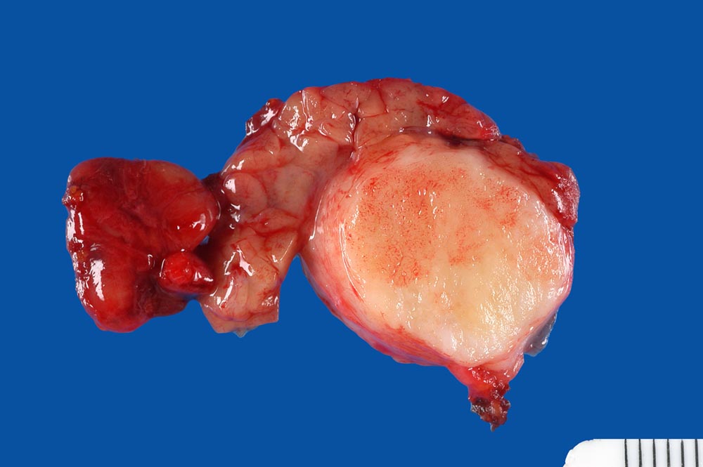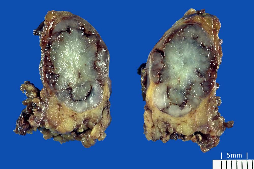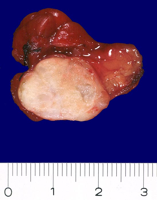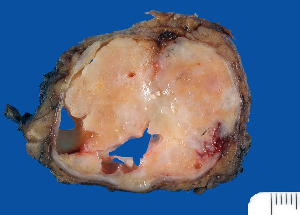 Makroskopie: Makroskopisch sind pleomorphe Adenome scharf begrenzt. In den grossen Speicheldrüsen sind die meist solitär wachsenden Knoten von einer Kapsel umgeben, nicht aber in den kleinen Speicheldrüsen. Rezidivtumoren bilden oftmals multiple Knoten.