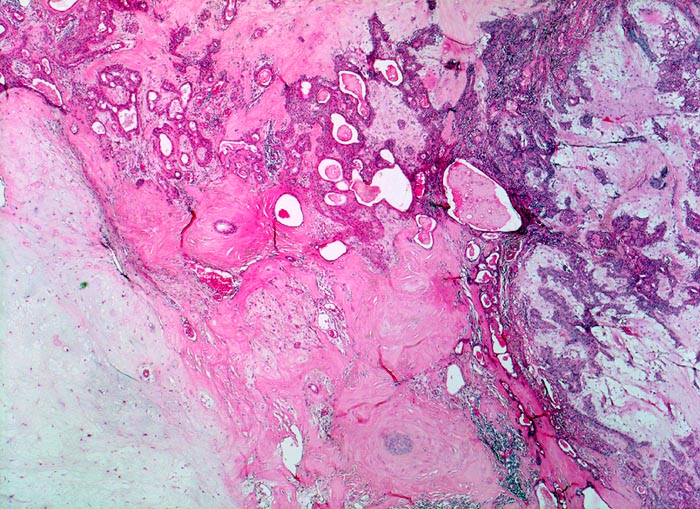 Die stromale Komponente ist teils mukoid, teils hyalinknorplig, teils hyalinisiert bindegewebig.