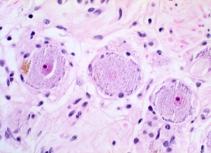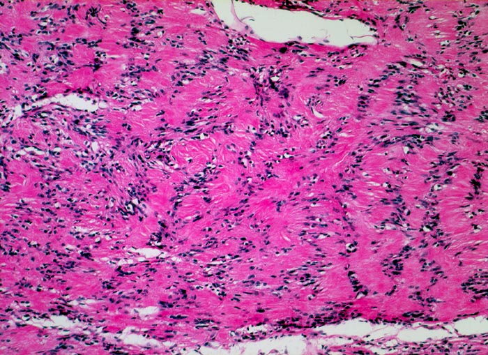Die histomorphologischen Befunde sind sehr variabel. Am häufigsten bestehen die Tumoren aus Zellzügen mit bipolar orientierten länglichen oder gewellten Kernen und langen Zellfortsätzen. In den sogenannten Antoni A Arealen (> 4295) sind die Zellen in kompakten Bündeln angeordnet, teilweise in Form von Verocay bodies (> 493) (alternierende Anordnung von Kernreihen und Zellfortsätzen). In den Antoni B (> 4296) Arealen bilden die Fortsätze der eher sternförmigen Tumorzellen ein lockeres Geflecht. Einzelne grosse, unregelmässig geformte und hyperchromatische Kerne und flächenhafte Nekrosen, Hyalinisierung oder fokale Verkalkungen sind Ausdruck degenerativer Veränderungen (sogenanntes ancient schwannoma (> 4299)) und dürfen nicht als Zeichen der Malignität fehlinterpretiert werden.