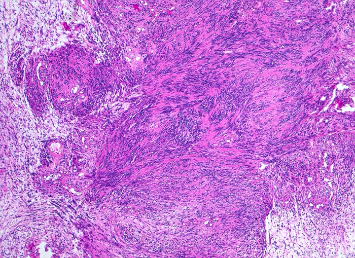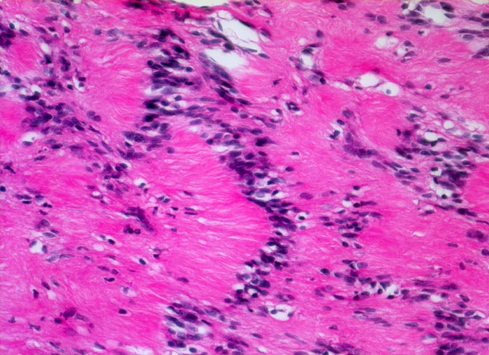 • Antoni B Muster: Lockerer Tumorzellverband mit runden Kernen und spinnwebenartigen Zellfortsätzen.