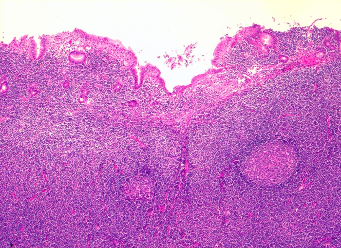 Histologisch finden sich meist nicht neoplastische Lymphfollikel. Die kleinen bis mittelgrossen an Zentrozyten (> 3334), Monozyten (> 3335) oder Lymphozyten (> 3336) erinnernden Tumorzellen infiltrieren die Marginalzone (> 3920) der reaktiven Follikel. Die Mantelzone ist meist erhalten. Meist sind vereinzelte an Zentroblasten oder Immunoblasten erinnernde Zellen (> 3332) beigemischt. Typisch für Marginalzonenlymphome ist die Infiltration der ortsständigen Epithelien in Form von lymphoepithelialen Läsionen (> 1010) (> 3333).