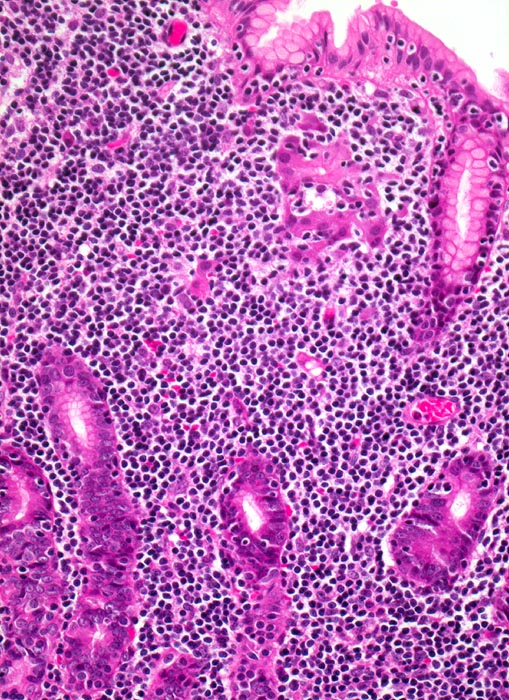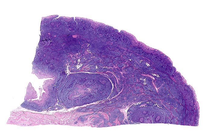 • Diffuses blaues, kleinzelliges Lymphominfiltrat in Mukosa, Submukosa und Magenwandmuskulatur.