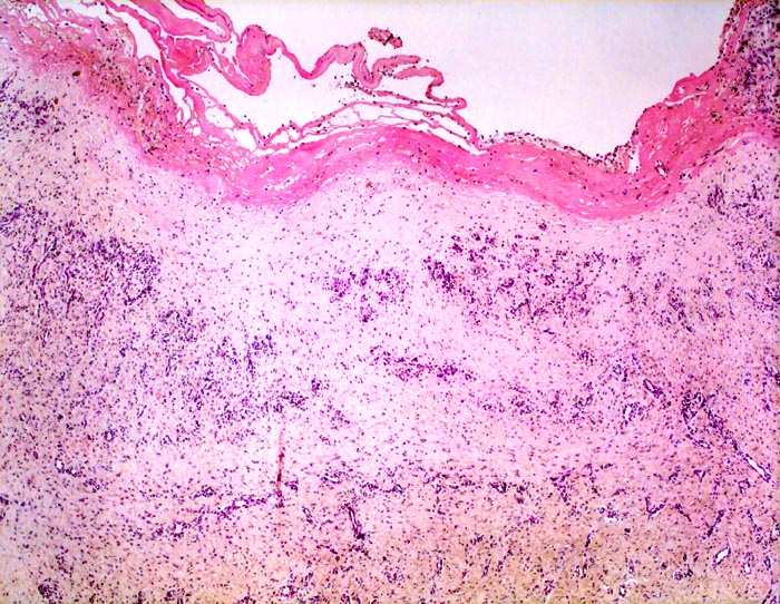 Daran angrenzend gefässreiches Granulationsgewebe mit lumennahen Erythrozytenextravasaten und Narbengewebe.