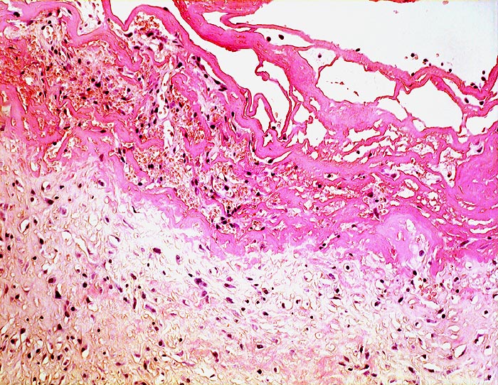 Als Folge frischer Schädigungen findet sich der inneren Oberfläche aufgelagertes Fibrin, das von Granulationsgewebe organisiert wird. Die operativ entfernten Bursen zeigen meist Veränderungen einer chronischen Bursopathie.