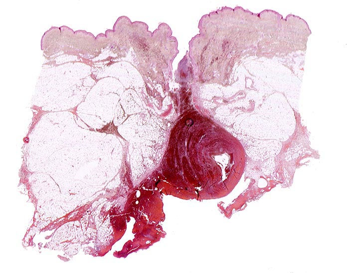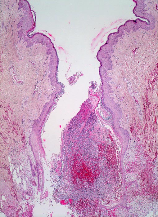 • Daran angrenzender Wundspalt im Bereich des subkutanen Fettgewebes mit Fibrinauflagerungen und ödematösem zellarmem Granulationsgewebe.