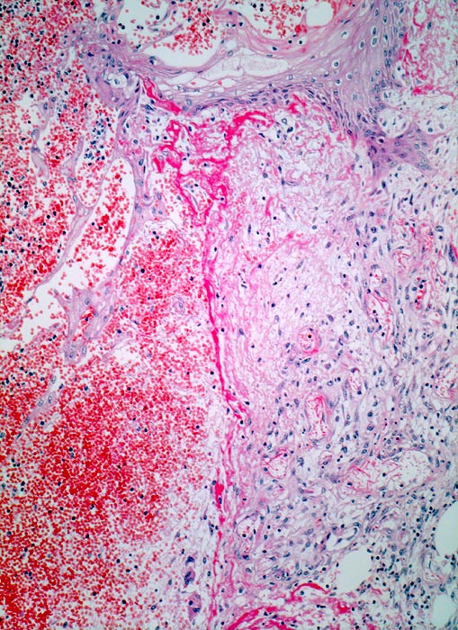 • An der Basis des Präparates Auseinanderklaffen des Wundspalts wegen grösserem Blutkoagel (verursacht Wundheilungsstörung).