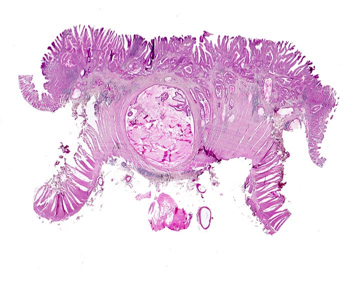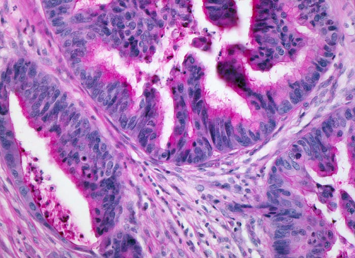 Die meisten Adenokarzinome des Kolons bilden Drüsen. Die Drüsenlumina enthalten oft nekrotischen Detritus und variable Mengen von Schleim. Der intraluminale nekrotische Detritus findet sich oft auch in den Metastasen kolorektaler Karzinome und gibt einen morphologischen Hinweis auf die Lokalisation des Primärtumors, wenn nur Gewebe aus einer Metastase für die histologische Untersuchung zur Verfügung steht.