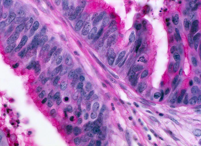 • Stark verminderte Schleimbildung in den Tumorzellen. Das sollte der Kliniker dem Pathologen mitteilen: