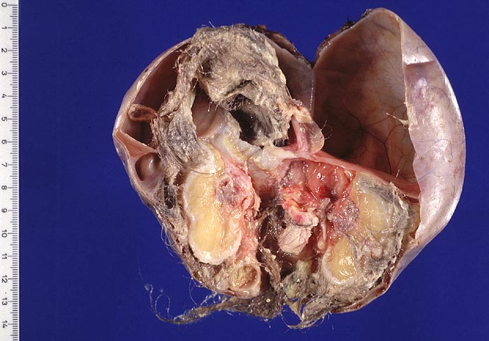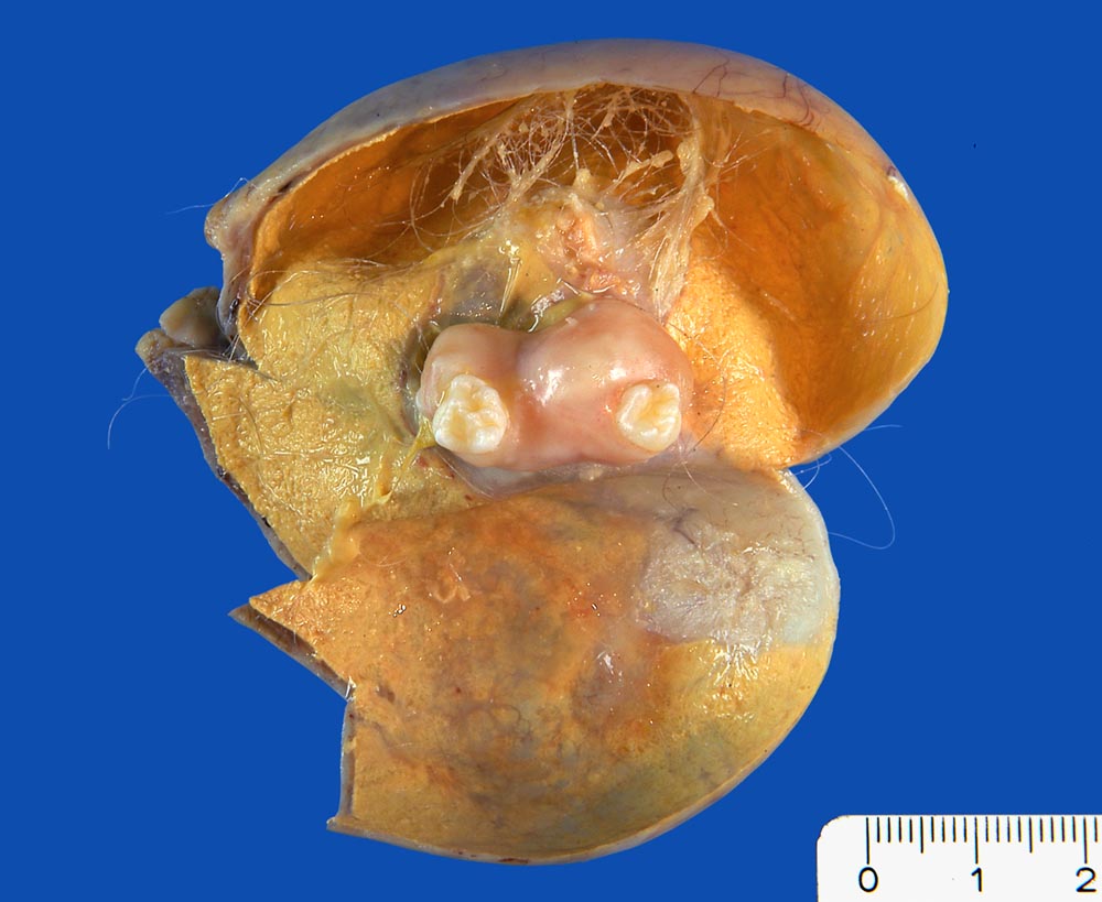 Makroskopisch sind reife Teratome leicht erkennbar. Ein zystischer Hohlraum ist gefüllt mit gelbem talgartigem Material durchmischt mit Haaren. Die Zystenauskleidung gleicht Haut. Eine oder mehrere polypoide Formationen bestehend aus Fettgewebe ragen in das Zystenlumen (sogenannter Kopfhöcker). Zähne, Knochen, Knorpel, Schilddrüsengewebe oder Hirngewebe können in manchen Fällen makroskopisch beobachtet werden.