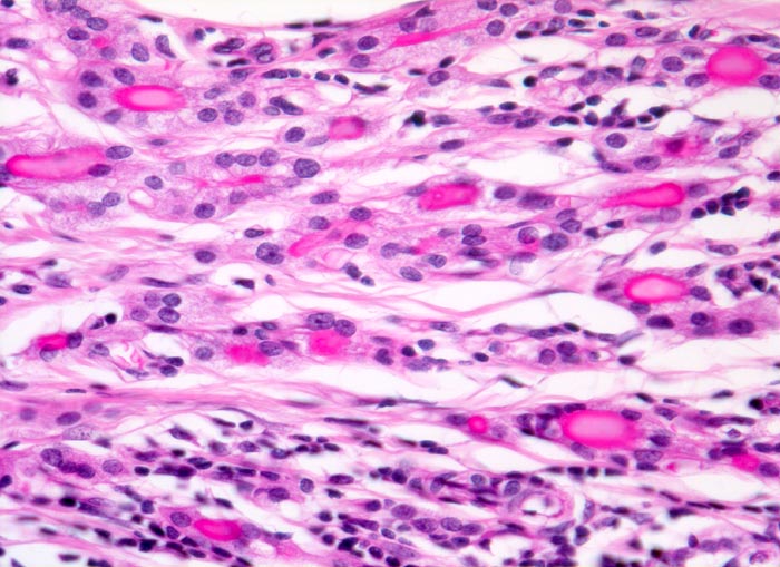 •  In beiden Gewebsfragmenten finden sich teilweise konzentrisch angeordnete meningotheliale Zellen mit reichlich blass eosinophilem Zytoplasma. Damit assoziiert reichlich psammomatoese Verkalkungen.