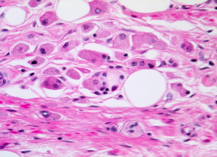 Histologisch dominiert in fast allen Fällen ektodermales Gewebe einschliesslich verhornte Epidermis, Talg- und Schweissdrüsen, Haarfollikel und neuroektodermale Elemente. Mesodermale Anteile umfassen glatte Muskulatur, Knochen, Zähne, Knorpel und Fettgewebe. Vom Endoderm abgeleitet sind respiratorisches und gastrointestinales Gewebe, Schilddrüse, Speicheldrüse und selten Retina, Pankreas, Thymus, Nebenniere, Hypophyse, Niere, Lunge, Mamma und Prostata. In der Zystenwand lässt sich oft eine lipogranulomatöse Entzündung als Reaktion auf Zysteninhalt nachweisen. Eine maligne Entartung einzelner Gewebsbestandteile kommt nur in 2% aller Dermoidzysten vor. Am häufigsten sind Plattenepithelkarzinome oder Adenokarzinome. Monodermale Teratome enthalten praktisch ausschliesslich einen Gewebstyp. Dazu gehören die Struma ovarii, Karzinoide (> 2982), neuroektodermale Tumoren und Talgdrüsentumoren.