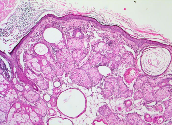 • Im mittleren Abschnitt des Präparates finden sich zystische Hohlräume, ausgekleidet von teils verhornendem Plattenepithel. Dieses ist assoziiert mit reichlich Talgdrüsen.