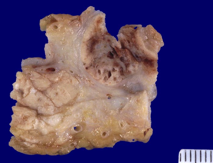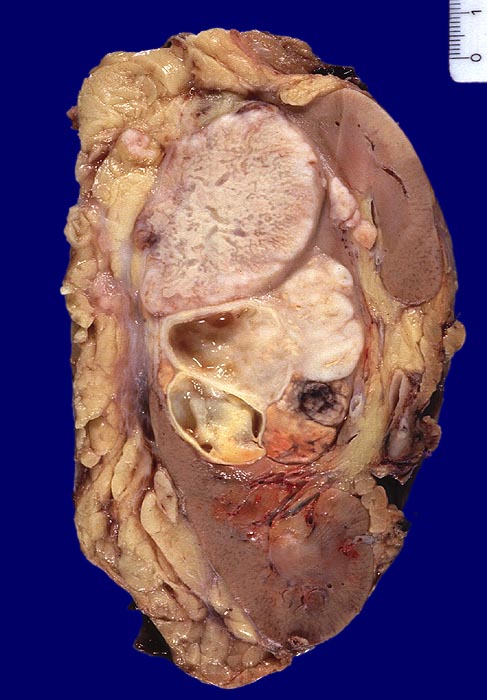 Expansiv wachsender, scharf begrenzter knotiger Tumor ohne Durchbruch der Nierenkapsel.