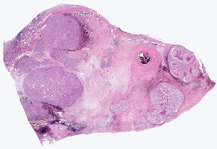 Wenig zellarmes Tumorstroma mit Blutungsresiduen.