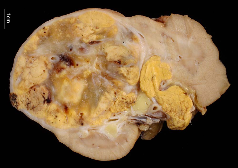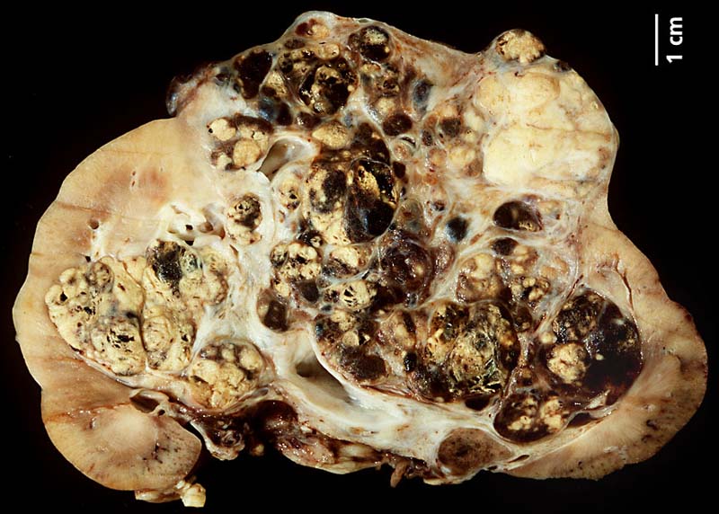 Klarzellige (alte Bezeichnung: hellzellige) Nierenzellkarzinome sind mit einem Anteil von etwa 75% der häufigste Typ. Es ist charakterisiert durch Tumorezellen mit einem klaren und/oder eosinophilen Zytoplasma, bevorzugt solidem Wachstumsmuster und ausgeprägter Vaskularisation. Das helle Zytoplasma der Tumorzellen und der pflanzenzellartige Aspekt resultieren aus ihrem hohen Glykogen- und Neutralfettgehalt ( 22). Die Schnittfläche der meist solitären klarzelligen Karzinome ist hellgelb bis grauweiss, oftmals mit Nekrosen, Blutungen und Zystenbildung. Dadurch entsteht das charakteristische „bunte“ Bild dieser Tumoren. Nierenkarzinome bilden zum angrenzenden Parenchym teilweise eine Pseudokapsel. Grosse Tumoren können in das perirenale Fettgewebe, das Nierenbecken oder nicht selten die Nierenvene einbrechen. In Einzelfällen entstehen Tumorthromben in der Vena cava, die bis in den rechten Herzvorhof reichen können.